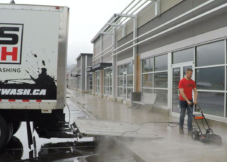employee pressure cleaning the sidewalk in front of a store