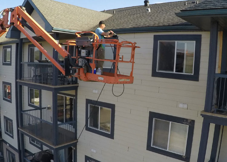 Employee in lift power washing 4th floor of building